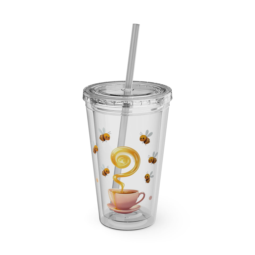 Sunsplash 16oz Tumbler – Pink Teacup & Bees, BPA-Free, Straw Included