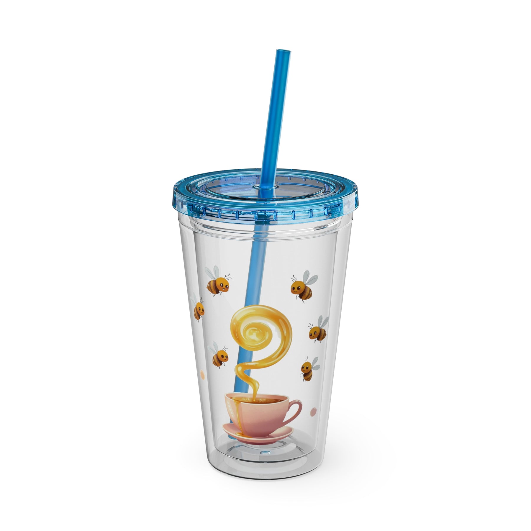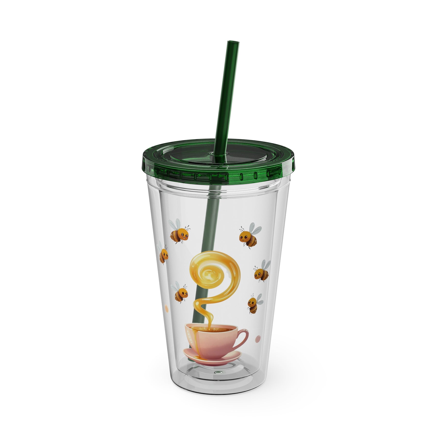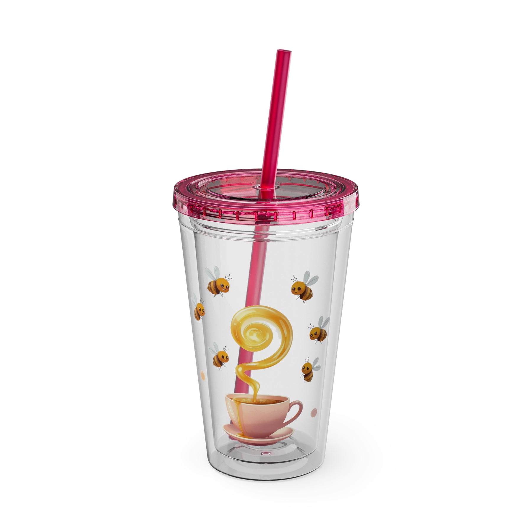 Sunsplash 16oz Tumbler – Pink Teacup & Bees, BPA-Free, Straw Included