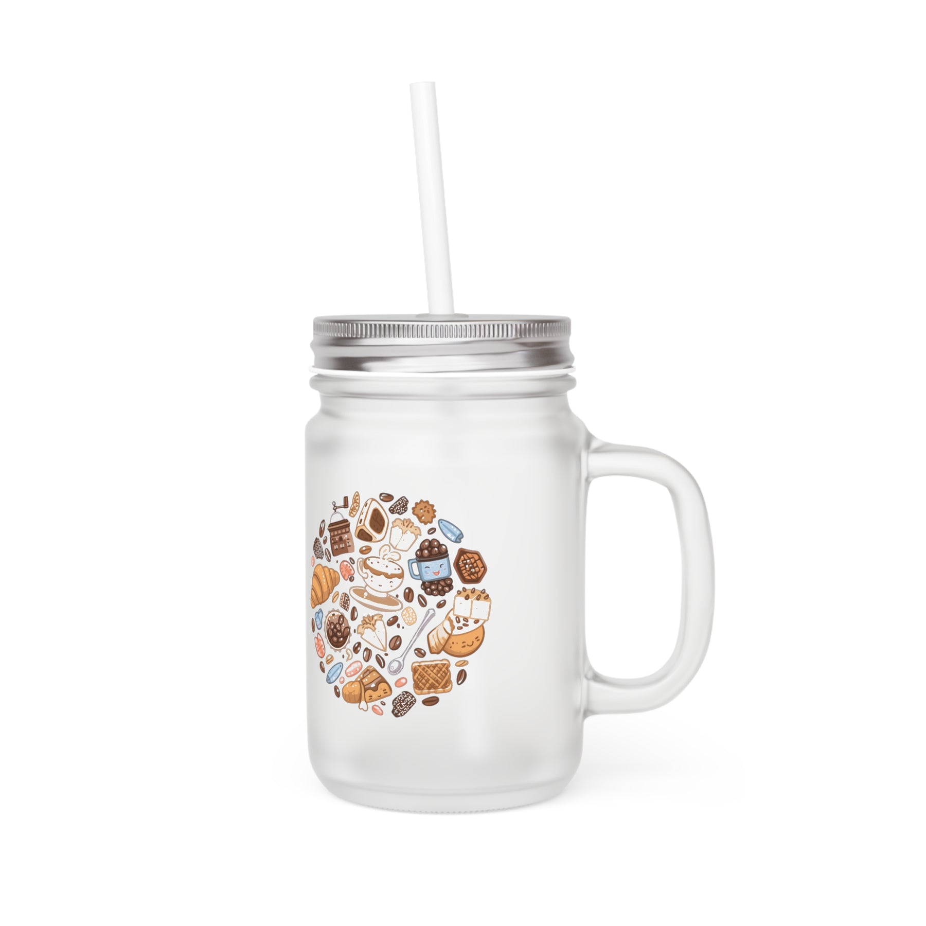 Custom Frosted Mason Jar – Cute Café Cartoon Design, 12oz, Lid & Straw